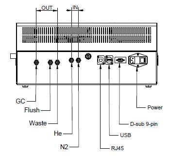 Gas supply to GC-unit controlled through the GIU and interchangeable connections on the rear panel for N2 and He2.